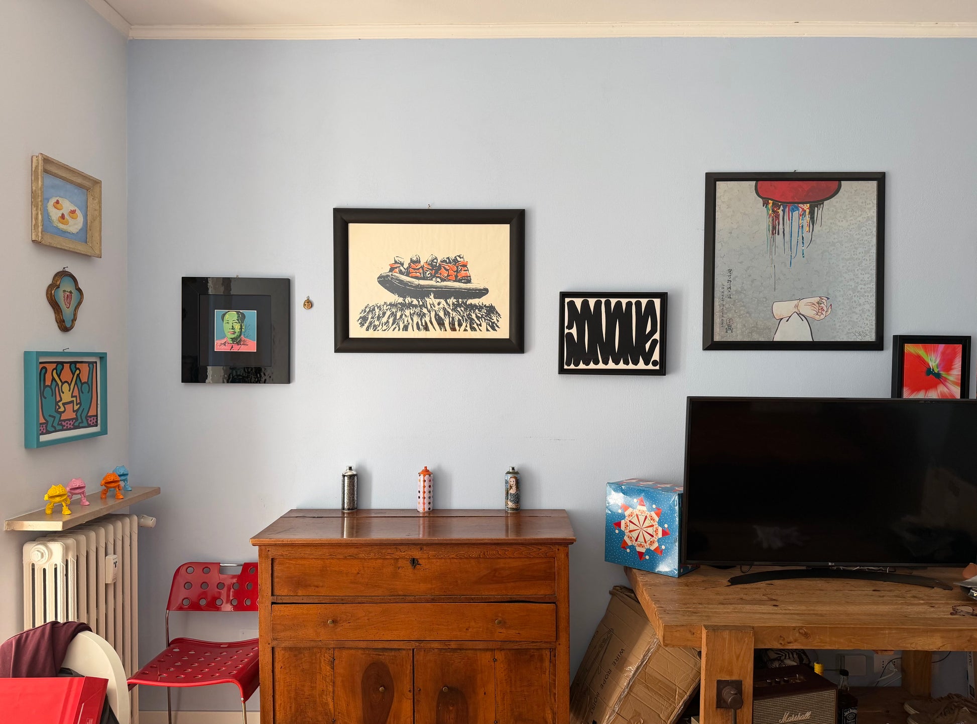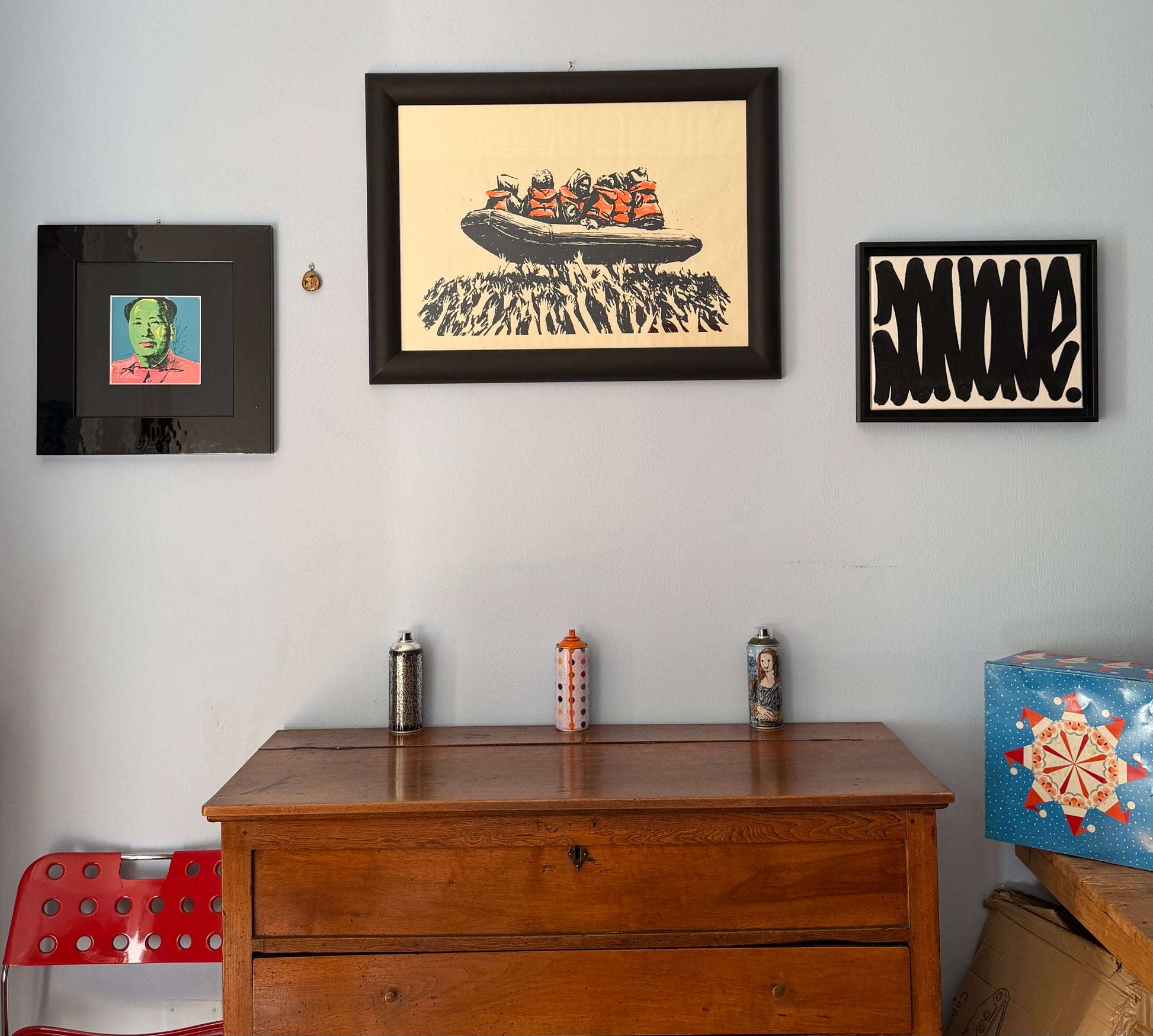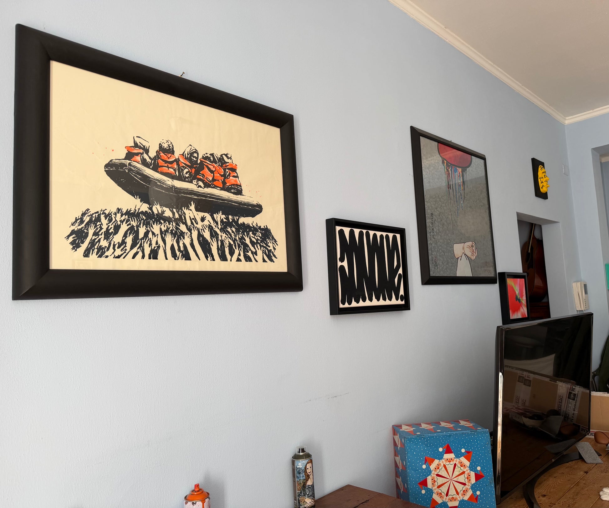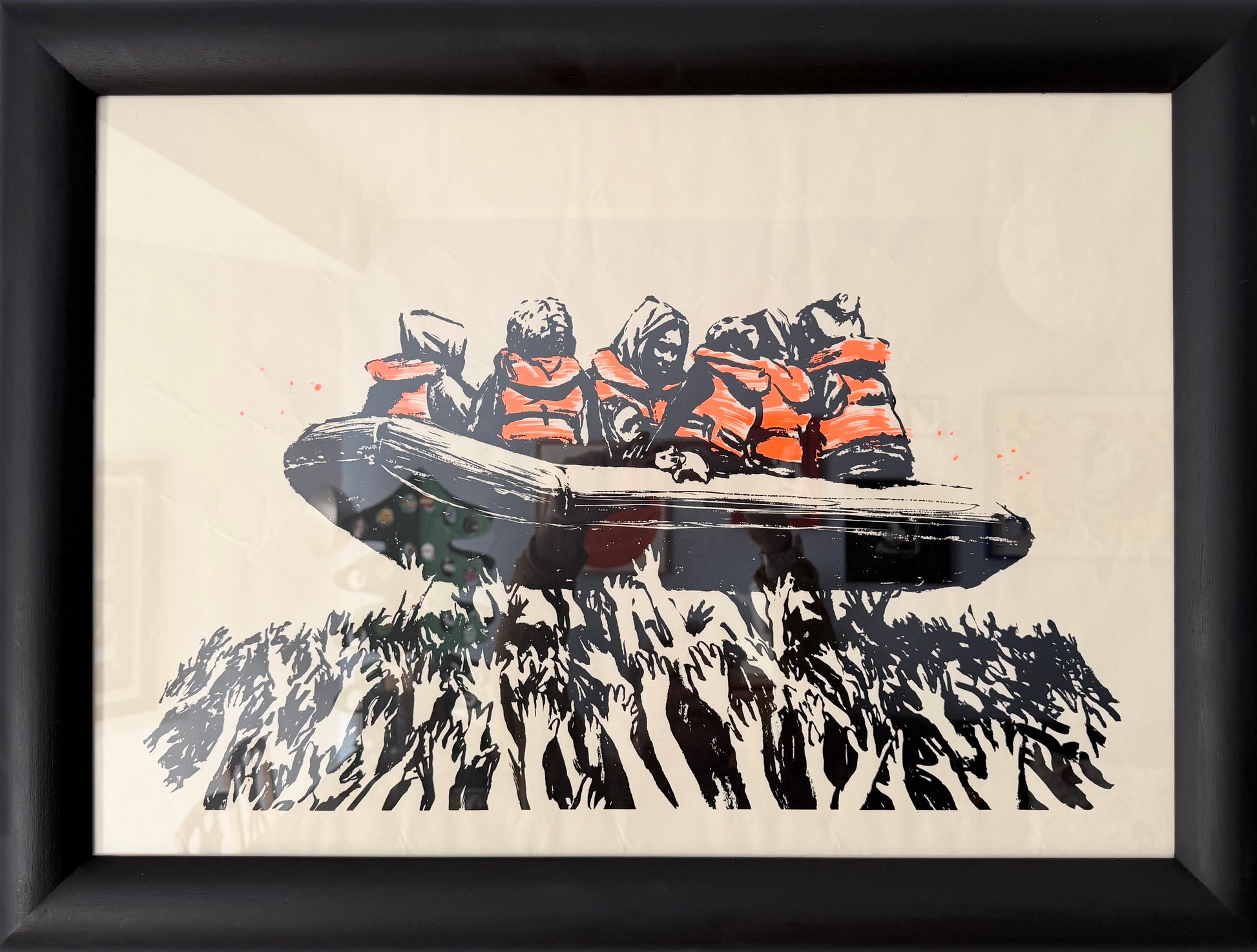 Serigrafia d’arte ispirata al celebre intervento di Banksy a Glastonbury 2024. Edizione limitata, stampata su carta riciclata color crema.