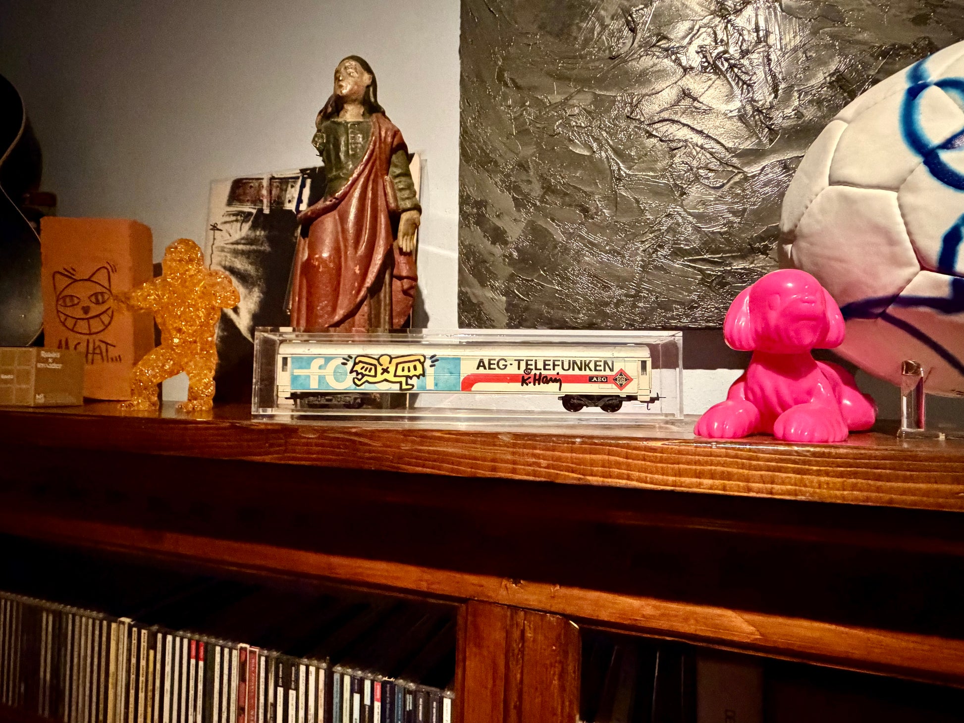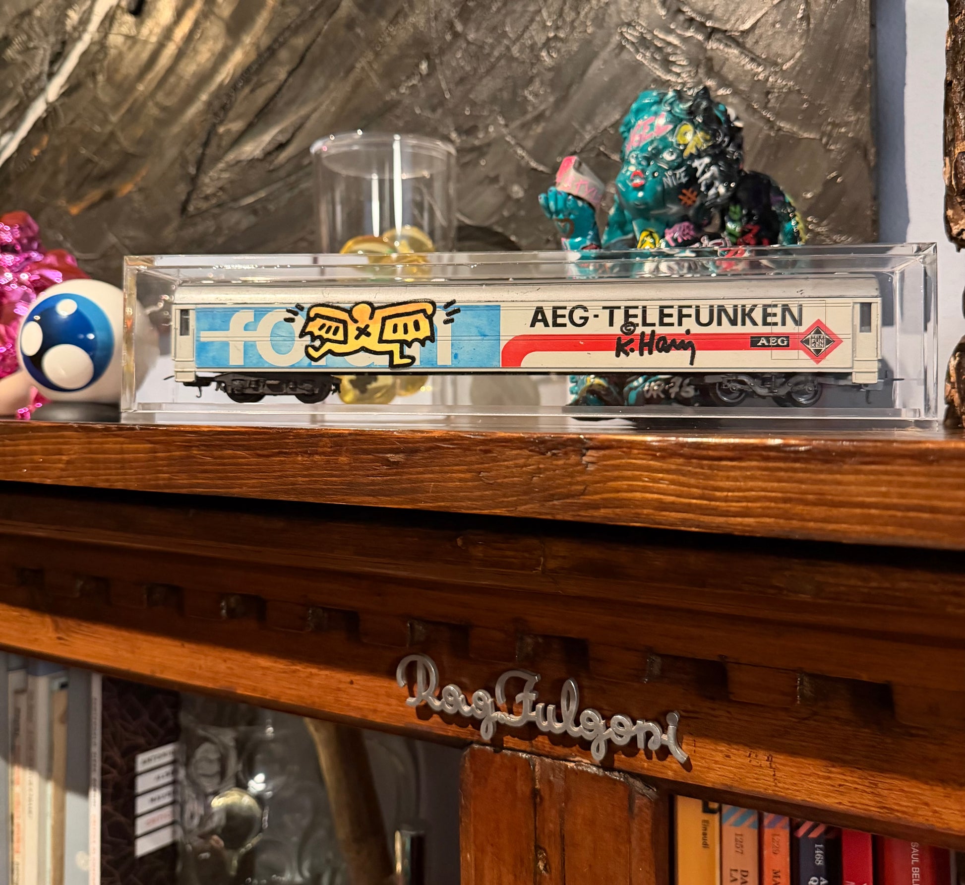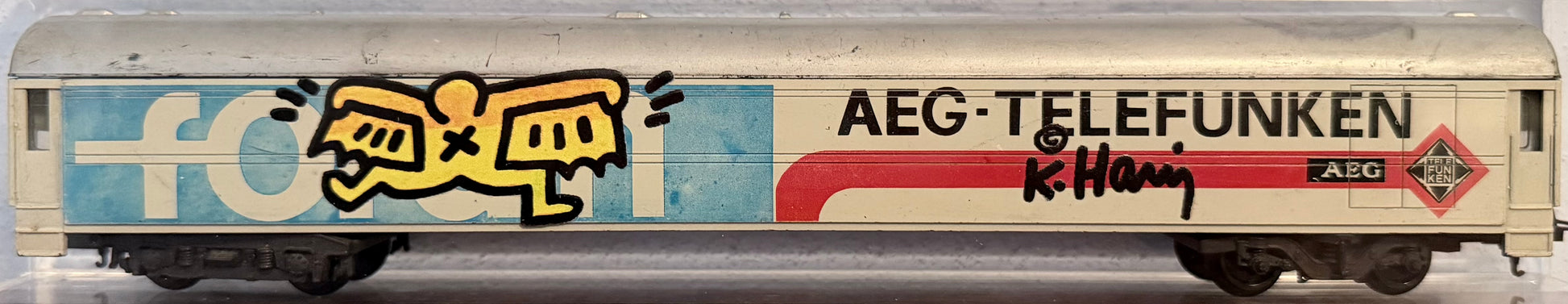 Oggetto unico personalizzato da Keith Haring. Vagone ferroviario in miniatura AEG Telefunken decorato a mano con disegni a pennarello e pittura, firmato su entrambi i lati dall’artista.