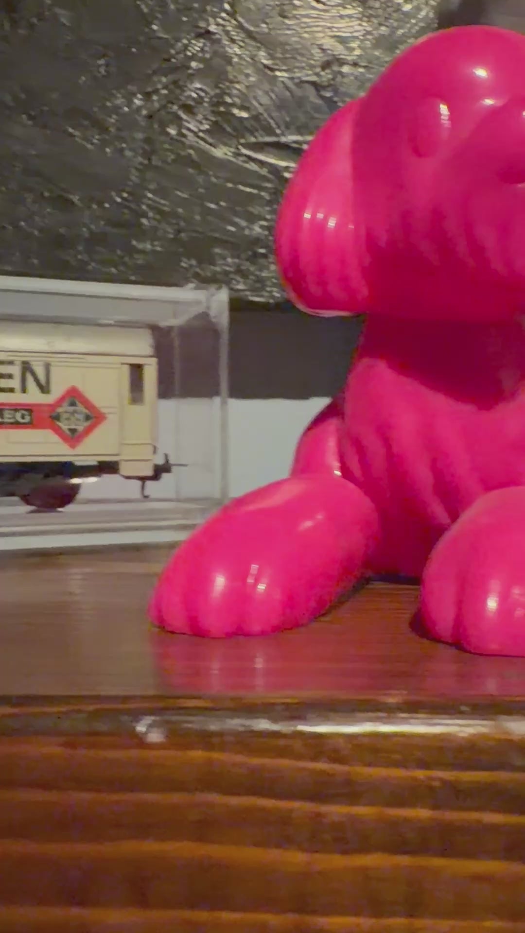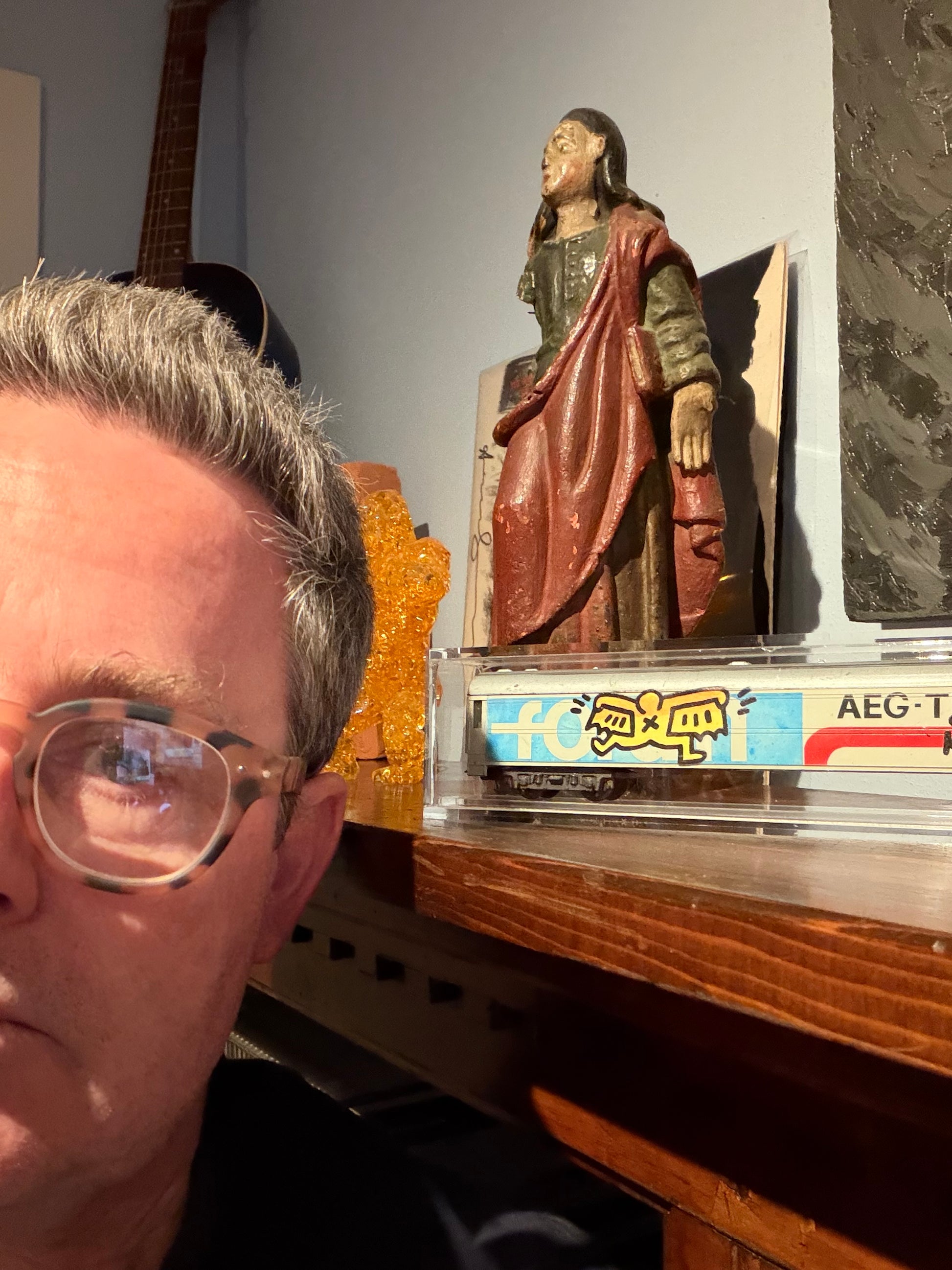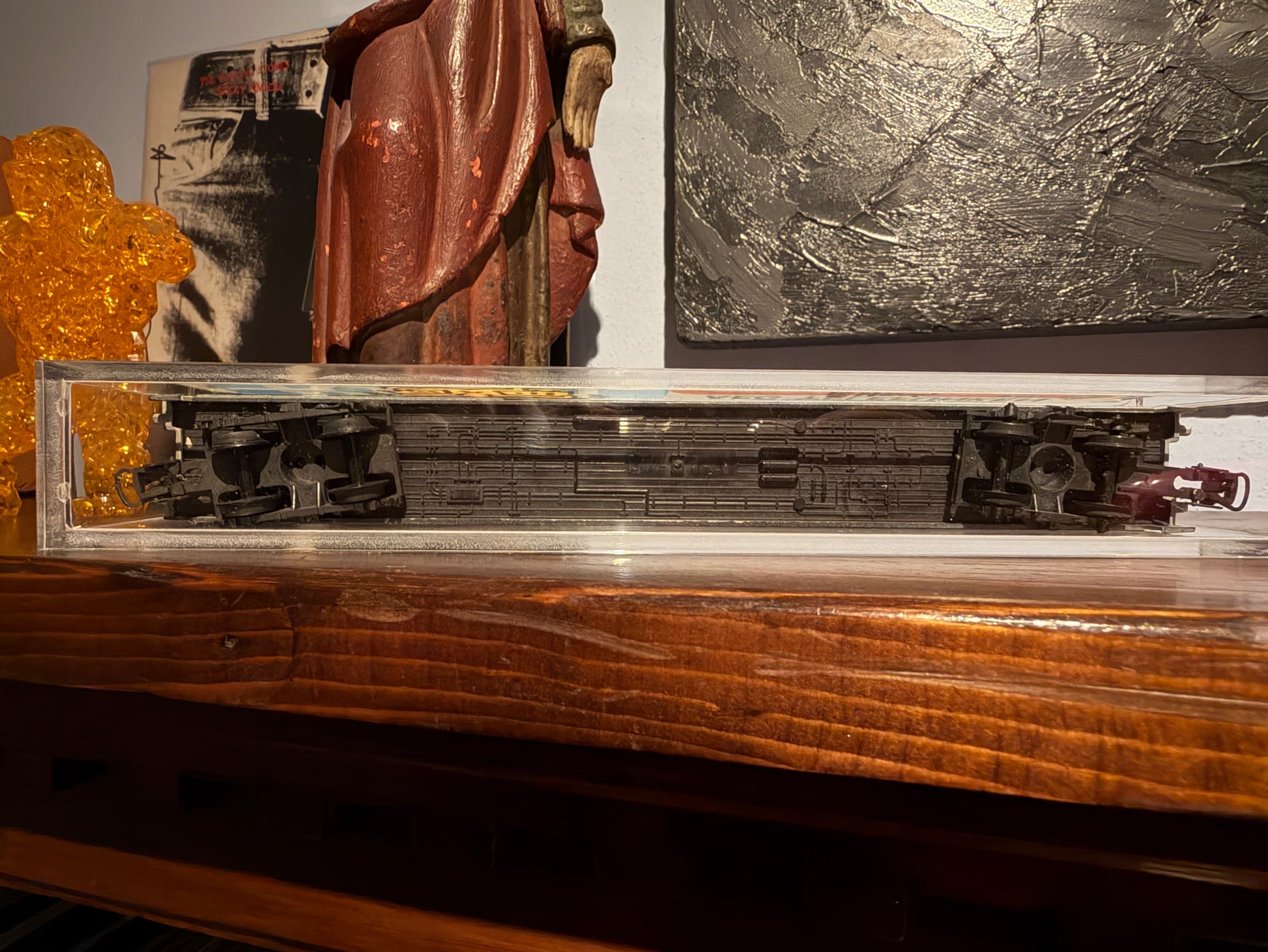 Oggetto unico personalizzato da Keith Haring. Vagone ferroviario in miniatura AEG Telefunken decorato a mano con disegni a pennarello e pittura, firmato su entrambi i lati dall’artista.