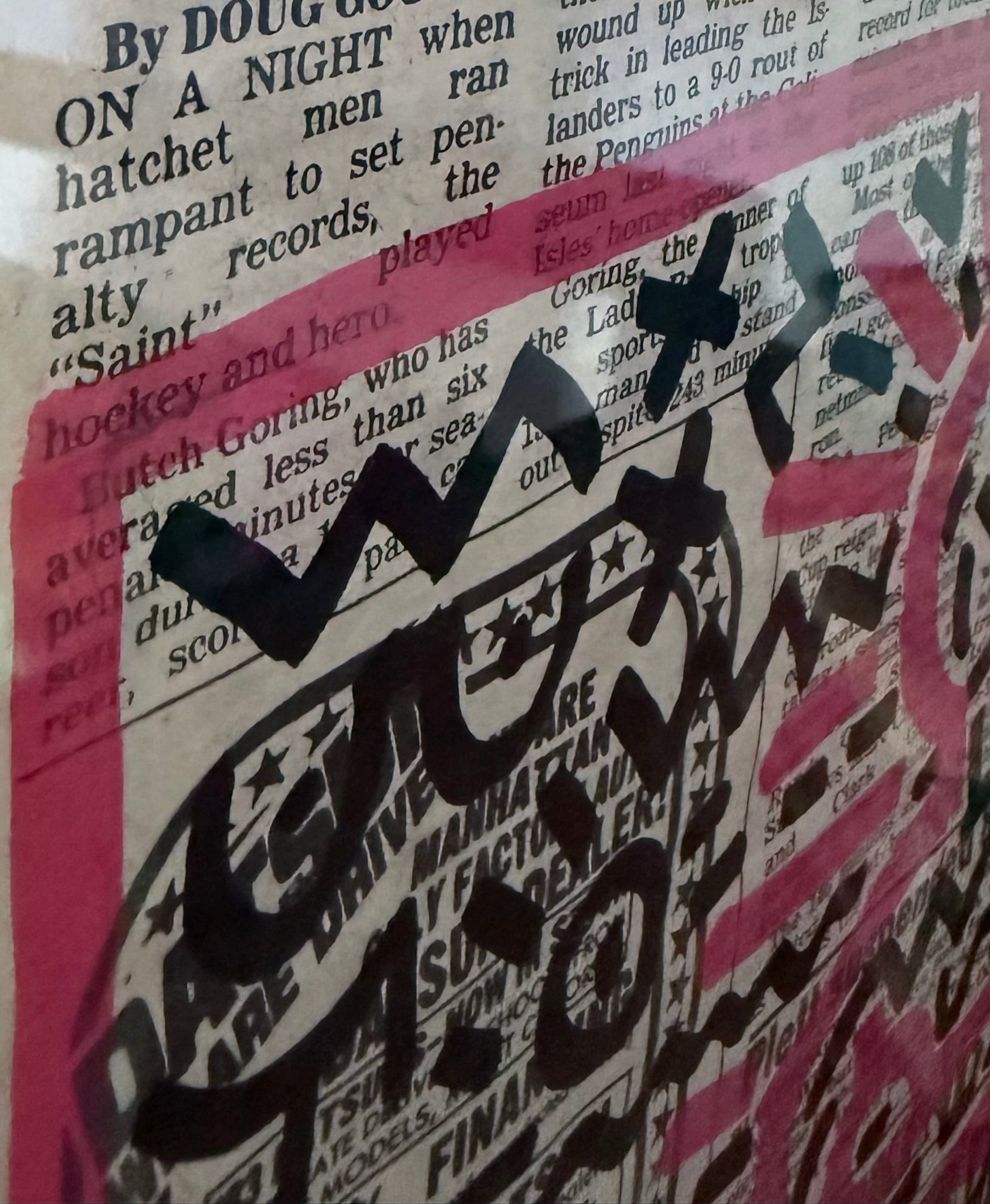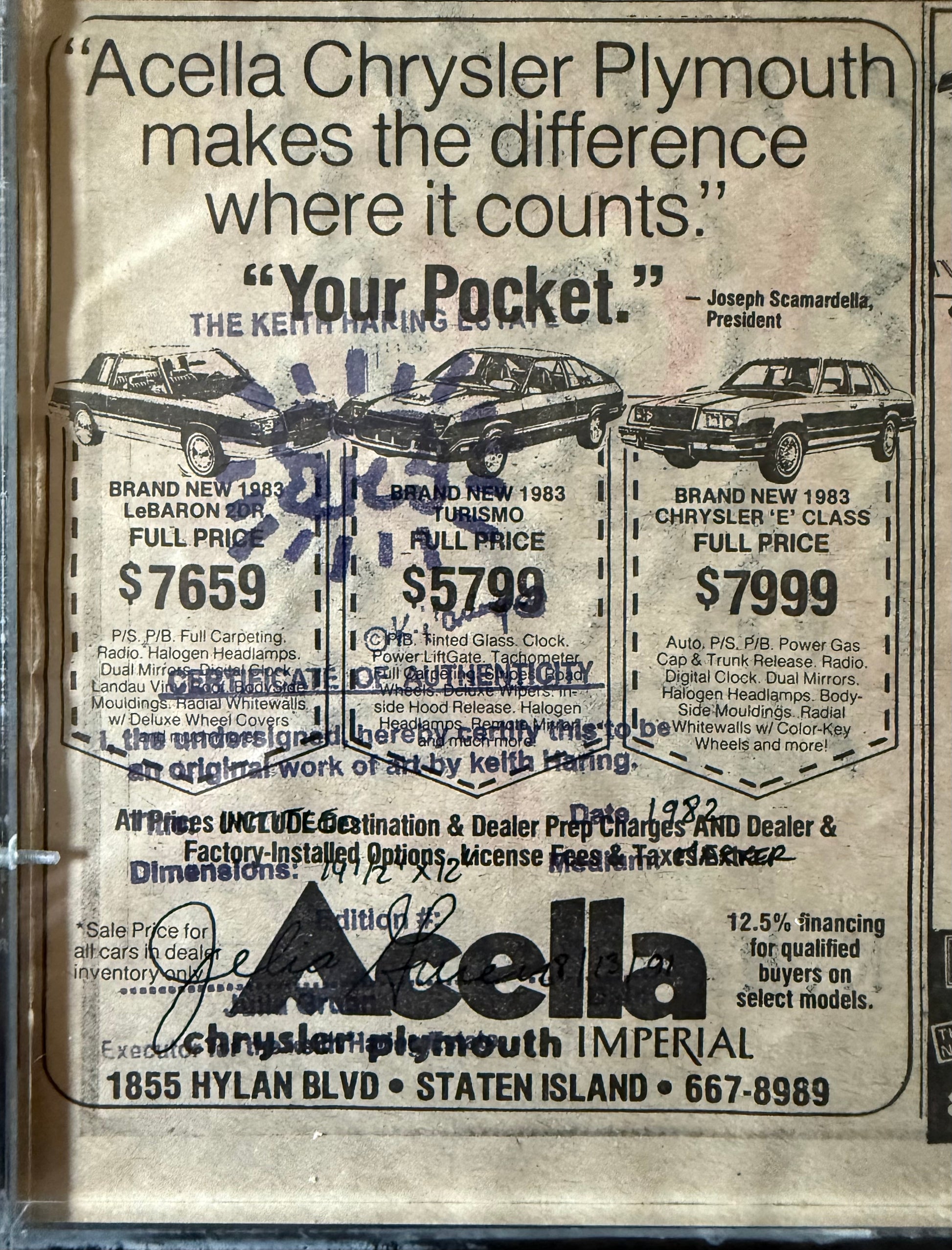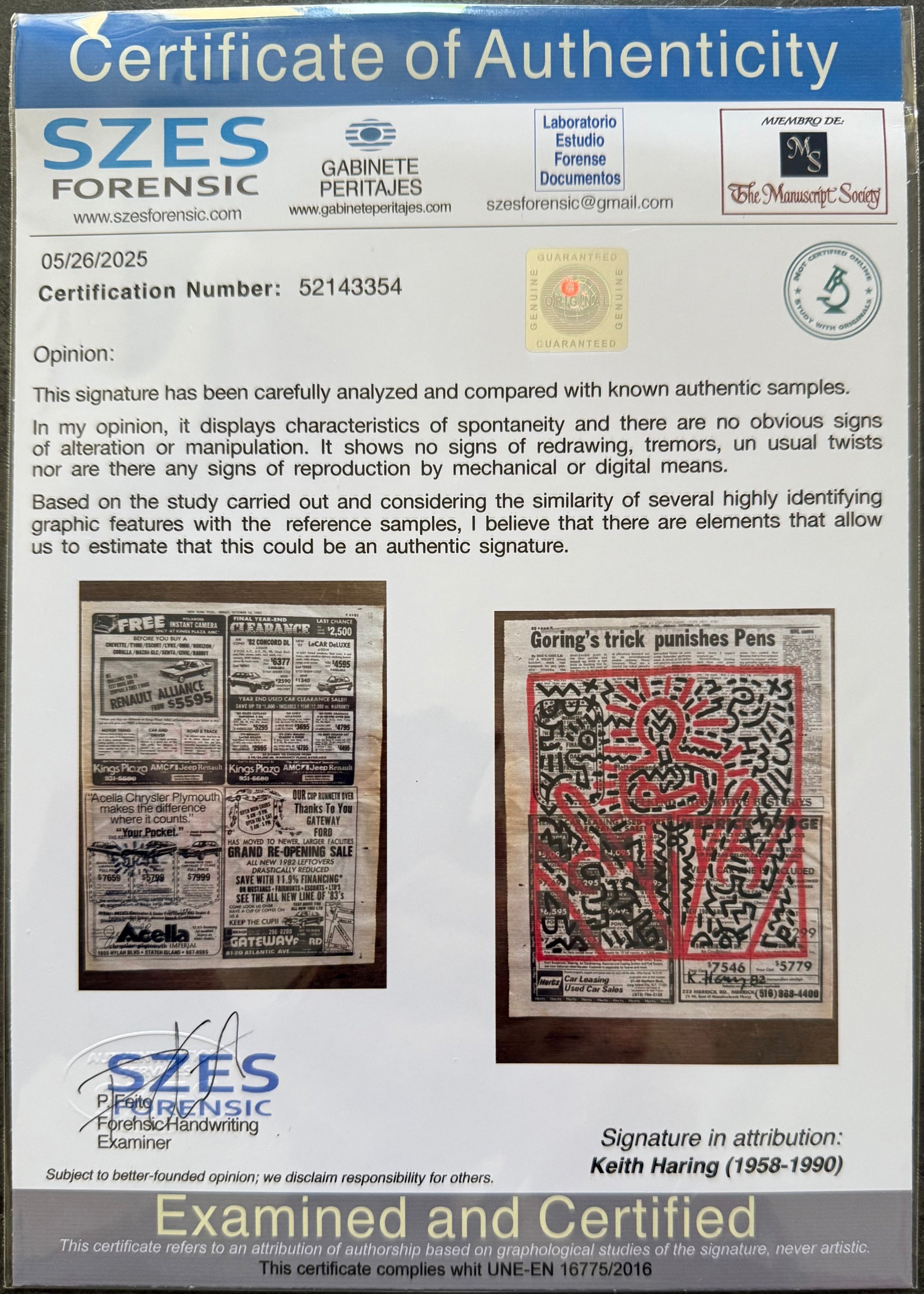 Opera unica realizzato da Keith Haring nel 1982 con markers rossi e neri su pagina di giornale, firmato a mano.