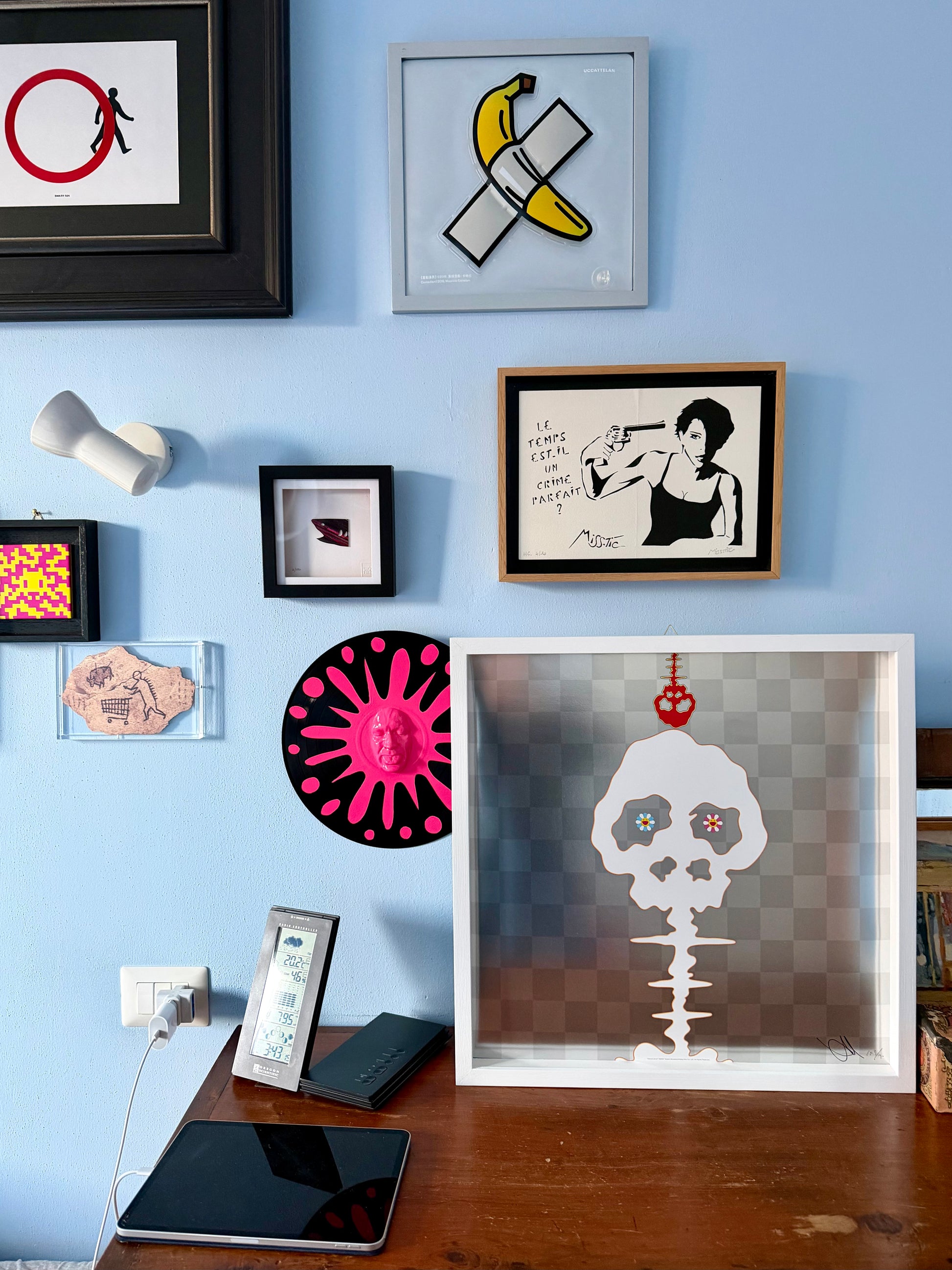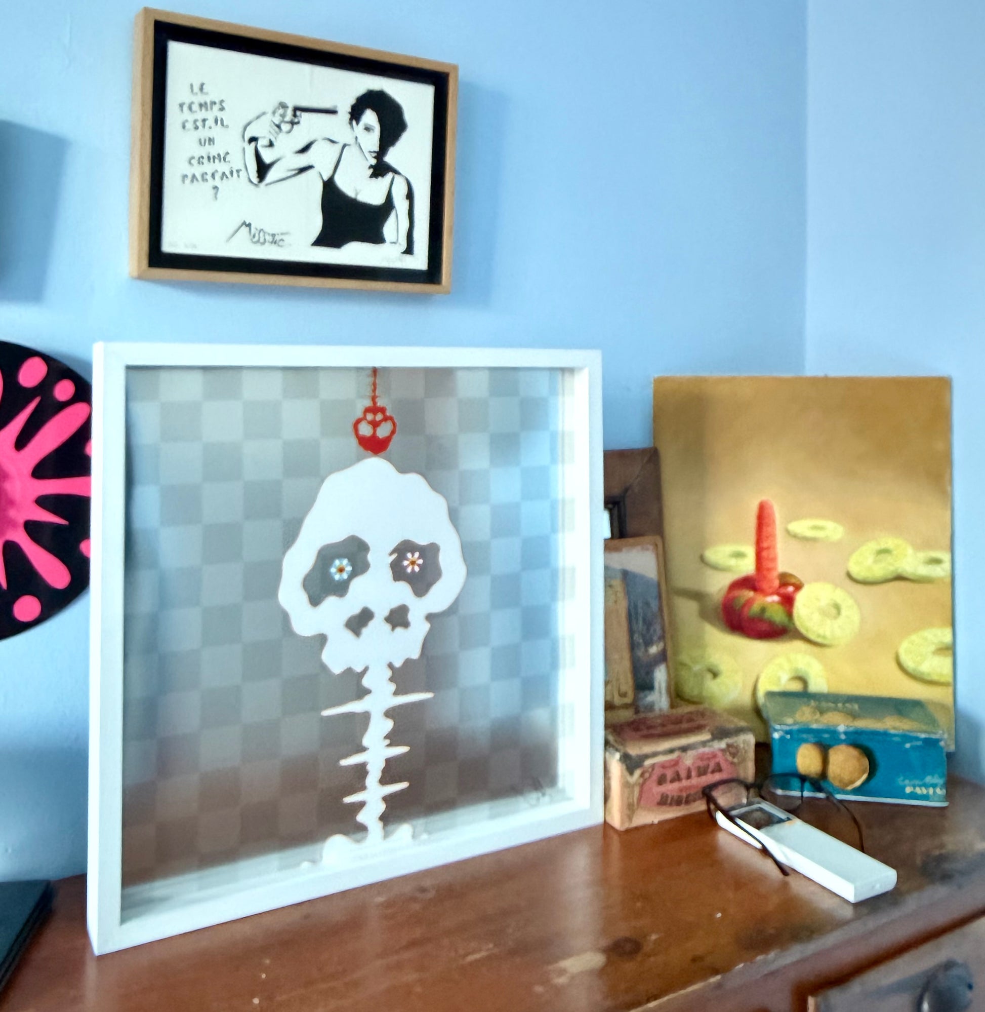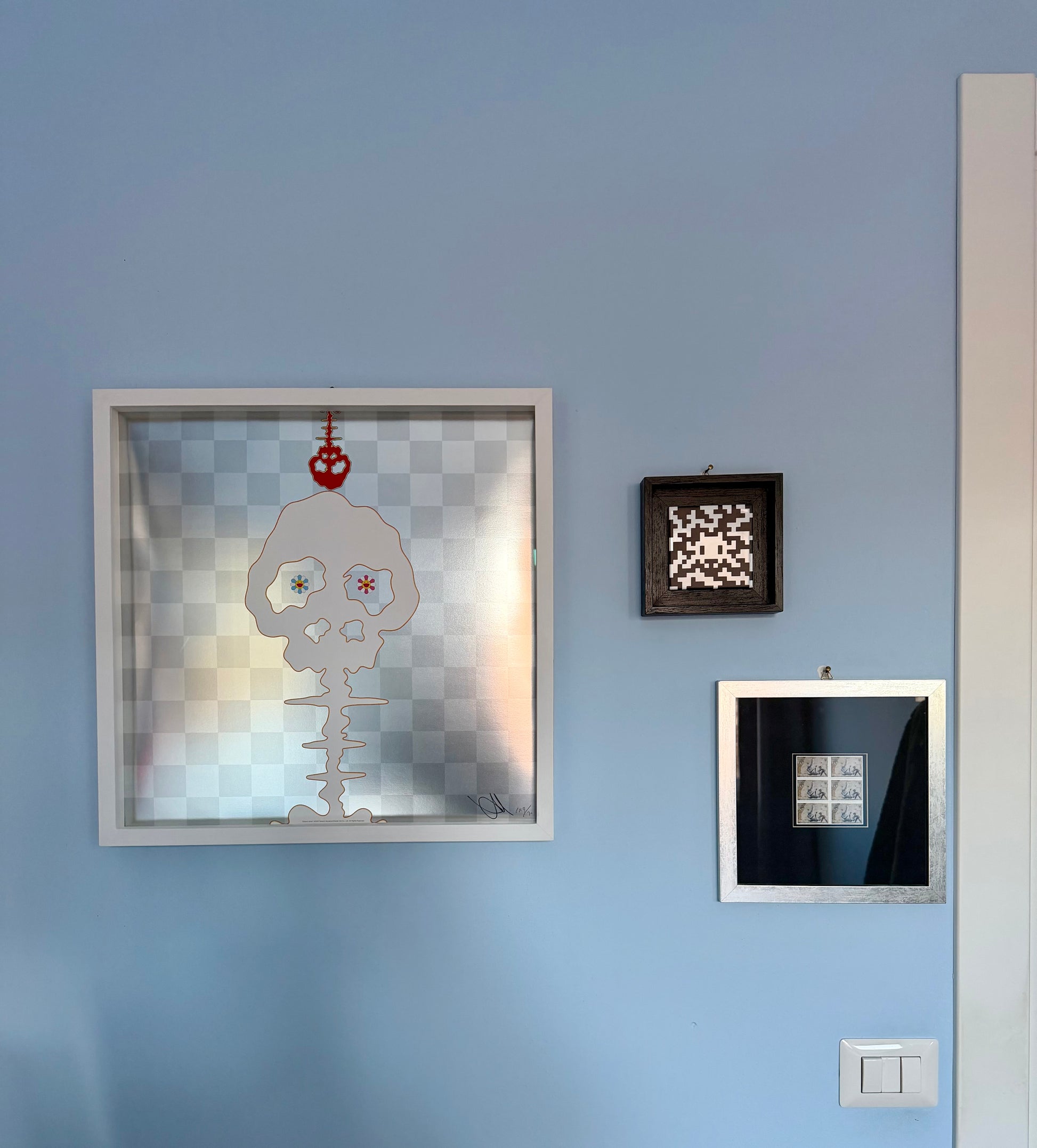 Stampa originale Dokuro Silver del 2000, firmata a mano dall’artista. Edizione limitata a 300 esemplari. Un classico iconico dello stile Superflat di Murakami.