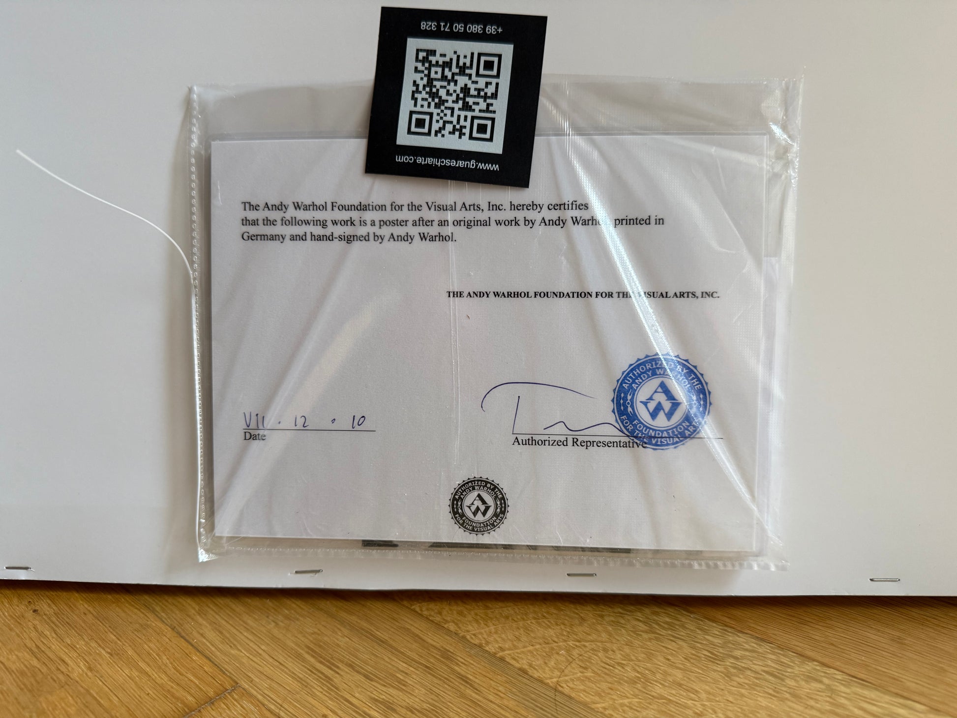 Certificato di Autenticità ufficiale rilasciato dalla Fondazione Andy Warhol, che ne garantisce l’archiviazione e la provenienza.